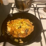 Then pour the egg and veggie mix into the pan, and let it cook undisturbed for four or five minutes.