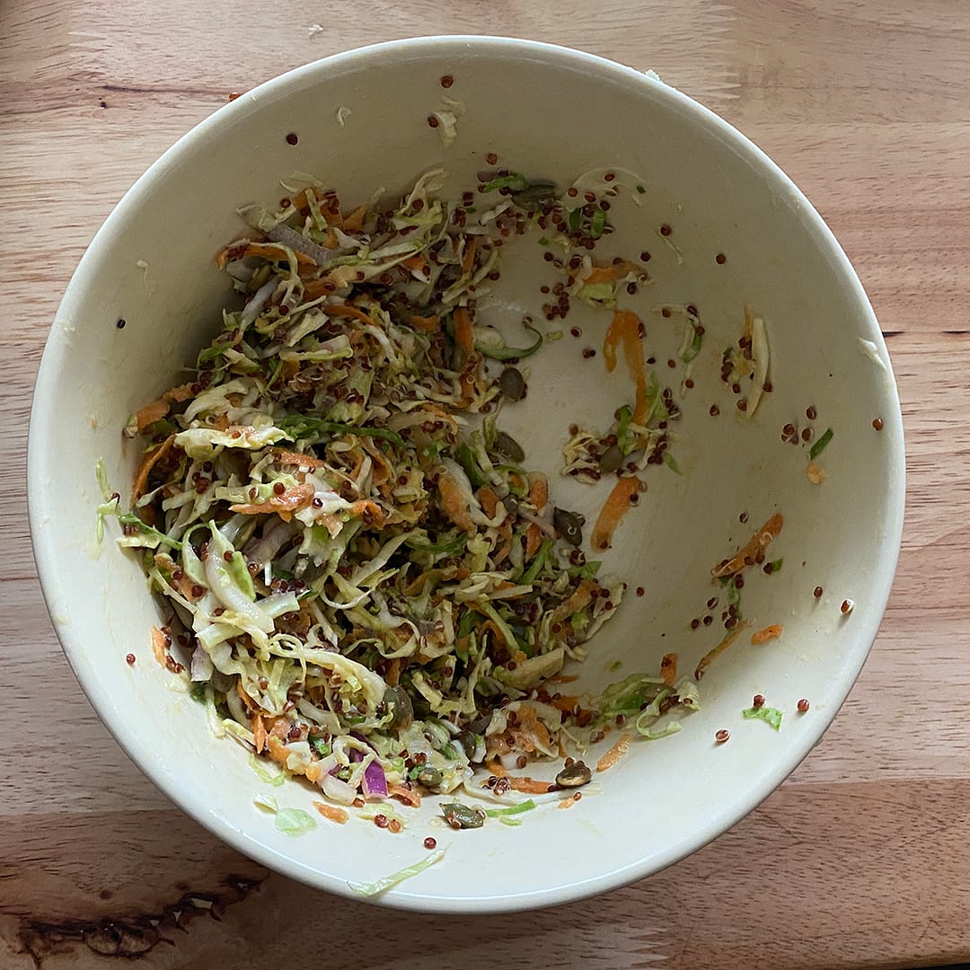 Of course, the success of this salad can depend somewhat on the veggies you use in the salad. I recently bought a mandolin and it shreds cabbage so beautifully. In my salad bowl was shredded wombok cabbage, grated carrot, and shredded (and then chopped) Brussels sprouts. It was a taste sensation!