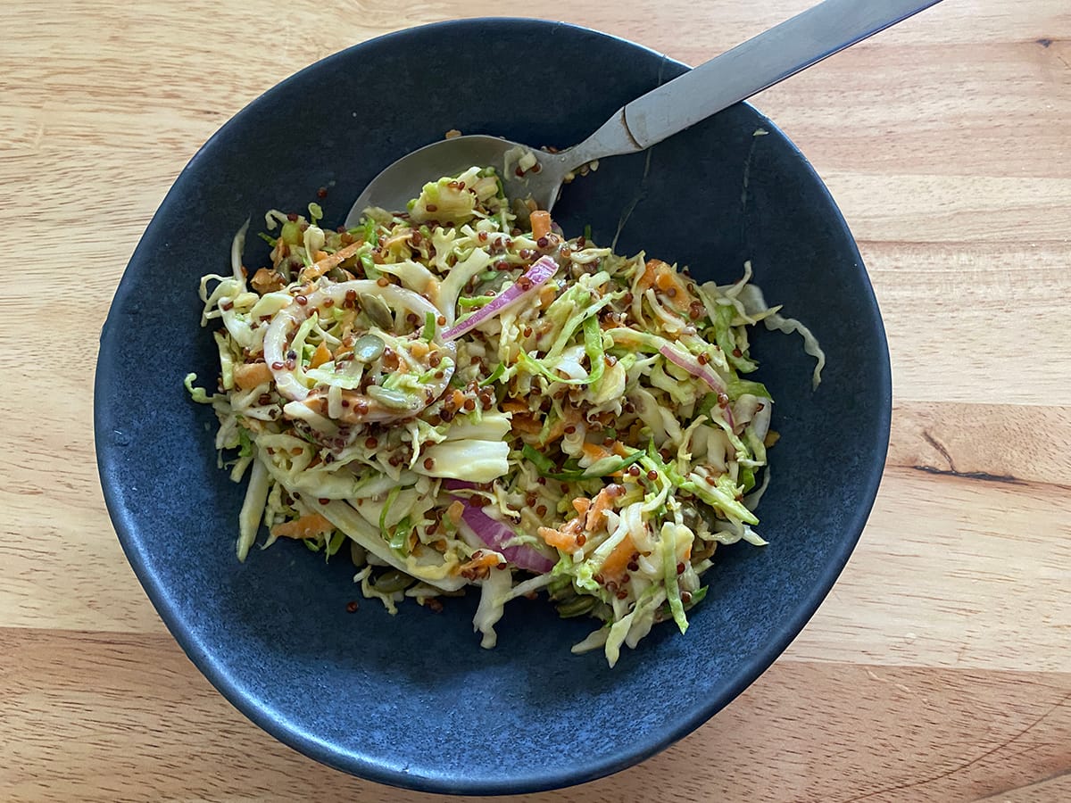 Of course, the success of this salad can depend somewhat on the veggies you use in the salad. I recently bought a mandolin and it shreds cabbage so beautifully. In my salad bowl was shredded wombok cabbage, grated carrot, and shredded (and then chopped) Brussels sprouts. It was a taste sensation!