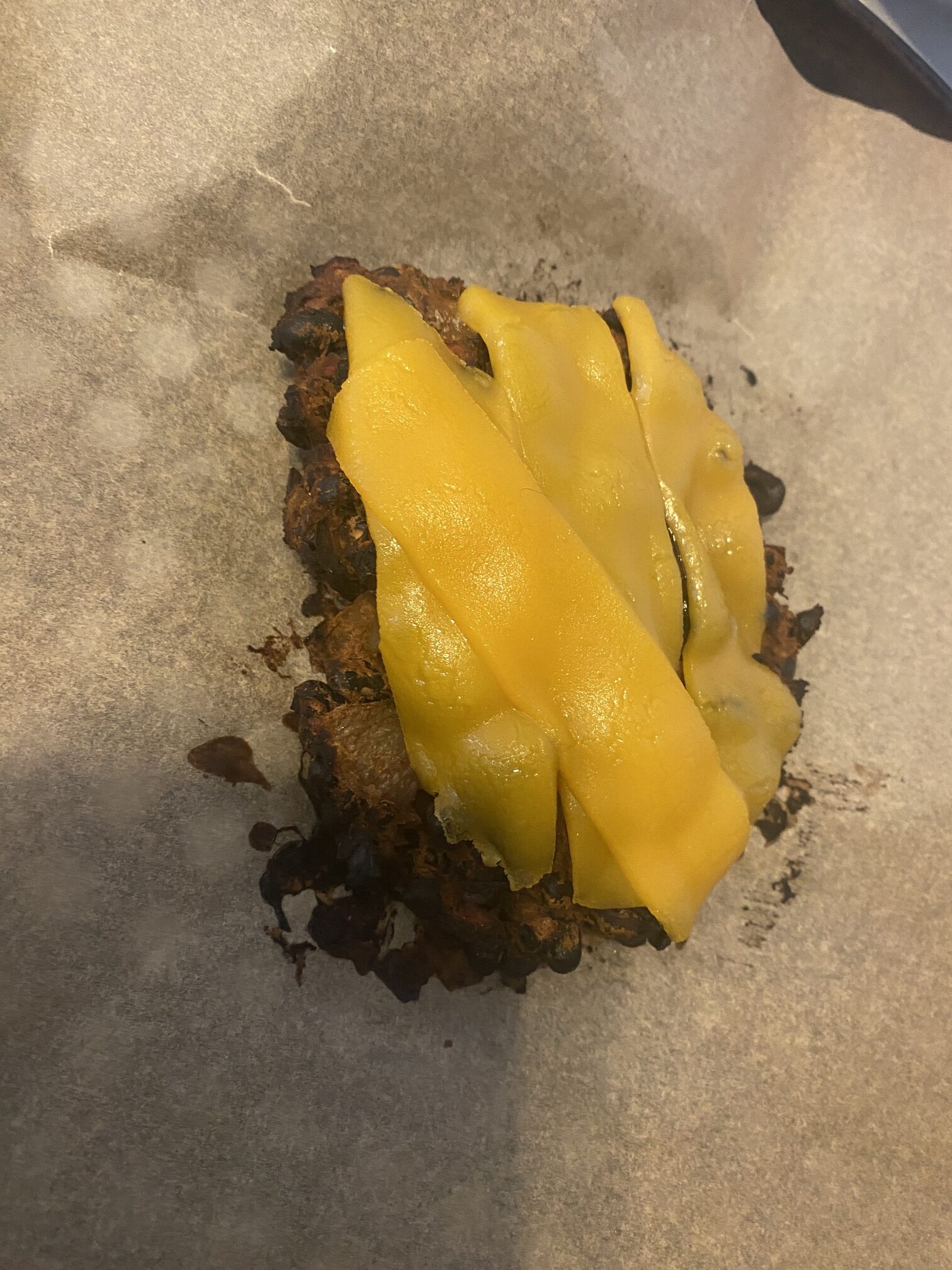 I took the rest of the mixture and formed it into a large patty today, and baked in the oven at 220 C for 25 minutes on one side, then 10 minutes on the flip side. I also added sliced American Cheddar slices to the top of the burger as it rested in the oven for another approximately 10 minutes.