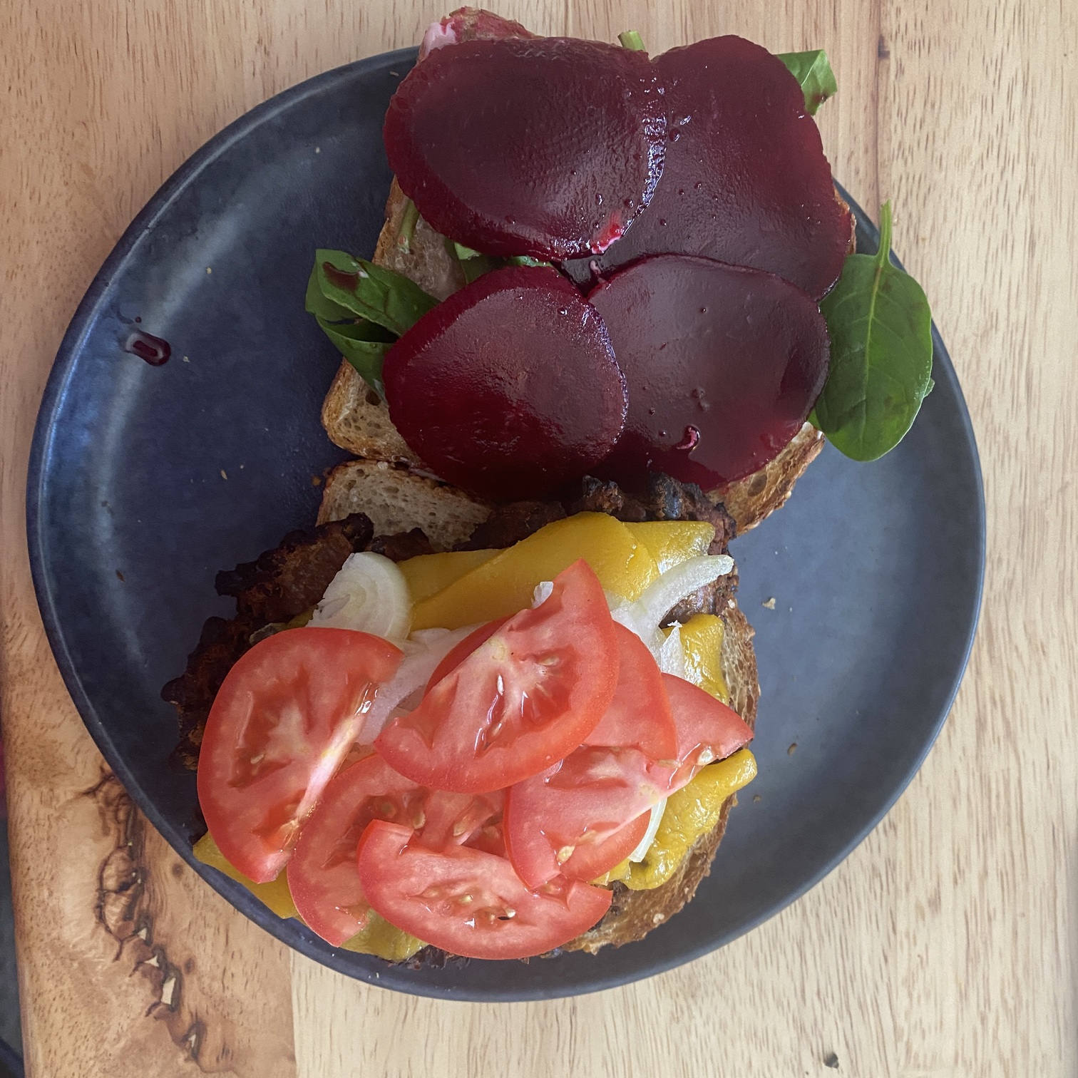 After melting the cheese on the patty, I added sliced onion then tomato. On one slice of bread I smeared hot mustard, and on the other side I smeared some mayo and layered spinach and then beetroot. I think this order might have been a bit out of whack, but it sure was delicious!